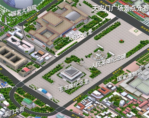 地处长安街南侧,在城中线位置,号称世界最大广场,广场正中间是人民纪念碑,广场西侧是人民大会堂,东侧为国家博物馆,在广场正对面是天安门城楼,每天清晨和傍晚都会有庄重升降国旗仪式,(升国旗仪式每天,早夏季在4点多,冬季7点多左右)