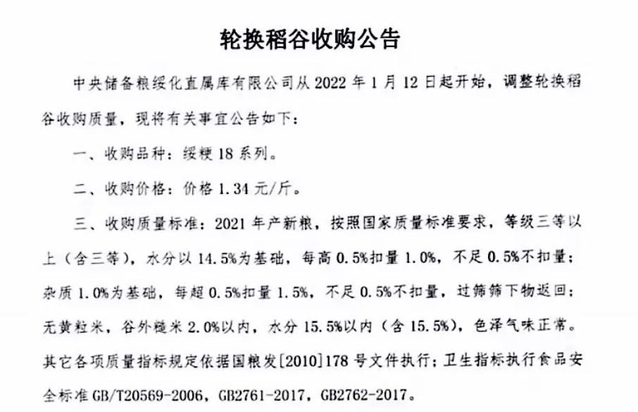 1月12日开始中储粮绥化直属库轮换稻谷收购价格1.34,品种绥粳18系列,质量三等及以上