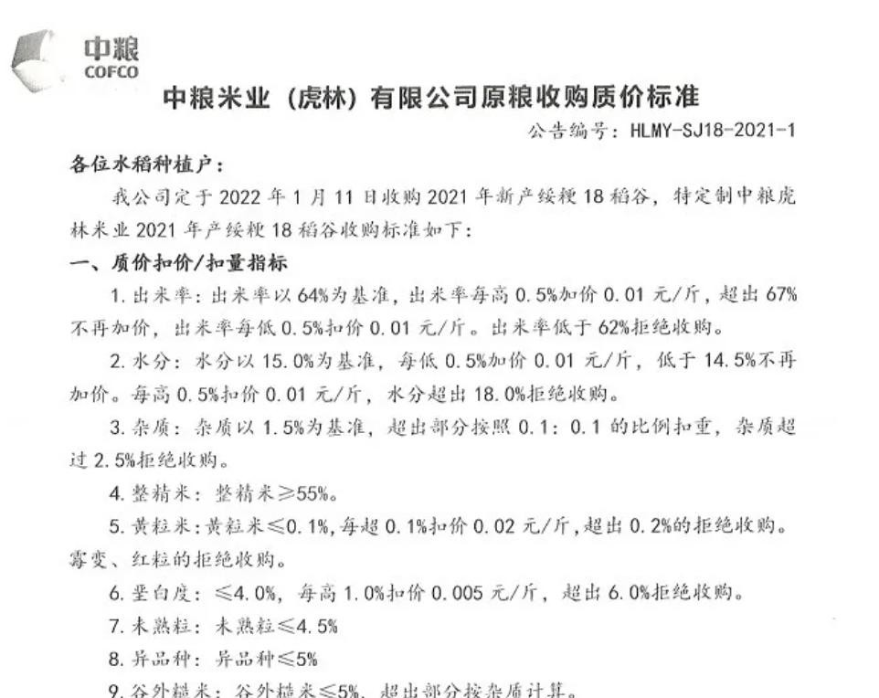 中粮虎林米业原粮收购质价标准——绥粳18稻谷,1月11日绥粳18稻谷1.30/斤,比上月17号发布公告落0.02元/斤