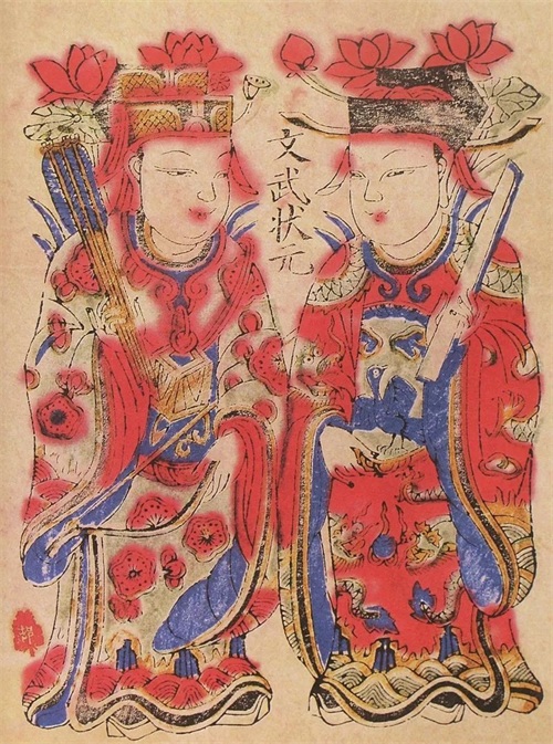 (二)软硬搭配:民间年画的色彩有软色和硬色之分,如黄色、绿色、桃红等为软色,黑色、紫色、红色等为硬色。关于色彩搭配,民间艺人有“软靠硬,色不愣”⑦ 之画诀,其实就是讲究色彩的轻重变化、明暗搭配。如在《鞭锏门神》中,画面中用了黑色(帽子、毛发胡须、钢鞭等处)、紫色(腰部、腿部)和红色(面部及全身各处)作为硬色,都是浓郁厚重之色;同时还搭配了黄色(铠甲、铜锏、腰腿部)和绿色(全身各处)作为软色以避免沉闷感,显得灿烂、透气。年画中软硬兼施的色彩搭配,相得益彰。色彩的软硬在表现不同性格身份时也要分别对待,民间年画讲究“文相软,武相硬”⑧。 表现文戏、文官一类题材多用软色,而武戏、武将则多用硬色。在《文武状元》和《三星在户》中,就没有用紫色一类的硬色,红色也是相对柔和、比较淡一些的水红色,还有一些明亮的蓝绿色。在童子门画中常常要增加桃红、粉蓝一类的软色,用在头面和手部。北京高碑店作坊印的门童画,先用蛤粉涂脸,再在脸颊染以桃红颜色。