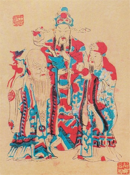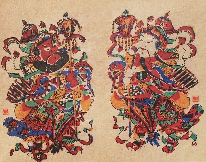 (四)均衡分布:由于印刷技术上的局限,木刻版画每块色版的颜色都要均衡分布。一方面避免塌版污损画面,同时也使得画面色彩缤纷,带有跳跃感。如在门神画《神荼—郁垒》的配色中,红色版是主色版,红颜色也不能只集中在某一个部位,而是从头到脚都有分布,只不过红色块相对大而且多。黄色块主要分布在头盔、铠甲、金瓜仪仗等处,位置偏上。紫色块主要分布在躯干和腰腿部,位置偏下,但在画面顶部的帽子尖和仪仗上部也有零星少量紫色。绿色版从上至下以细长条状分布,面积大些的绿色块也相对靠下方。紫色和绿色都是作为“筋骨”,要稳住重心,起到压阵的作用。总体上,色版颜色分布原则是按照有重点有主次地均衡分布。