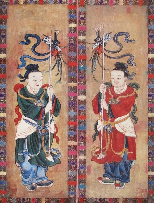 (五)背衬底色:如在《绿地门神》中,用深绿色的底色衬托画面中盔甲等饰物的金色和其他红蓝纯色,表现出金碧辉煌的效果。在《麒麟送子》《天仙送子》《龙凤呈祥》《富贵临门》等门画中,背景都有深绿底色。画面前景中童子粉白的头面上染着桃红色脸蛋,还有红色“双喜”字和黄色“葫芦万代”的图案在深绿背景衬托下,都显得绚丽多彩,画面丰富而又统一。