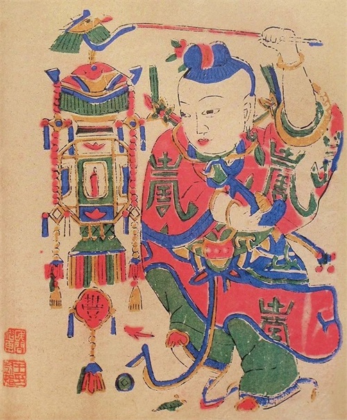 (三)以色压阵:民间木版画常以分量重、有韧劲的色彩支撑画面阵势。民间艺人画诀“紫是骨头,绿是筋”,讲的就是用紫、绿这种能起到筋骨作用的颜色来支撑画面结构。在《秦琼—尉迟恭》中,幽深的紫色块很强劲,很有力量感,在画面中起到“骨头”的作用。偏冷的绿色,有通透感,有韧性。画中分布的少量条状绿色显得透气,强硬中增添了韧劲。北京的将军门神画中多用这种“以色压阵”的色彩表现手法。