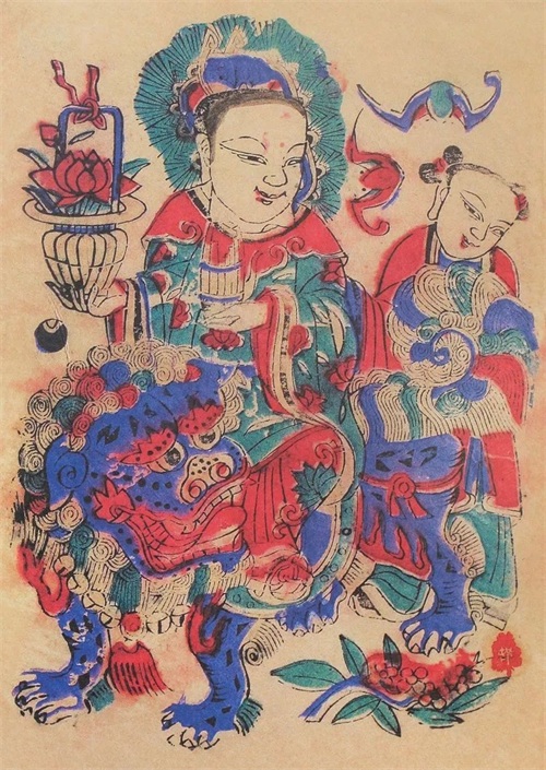 (一)主调统领:装饰年画的色彩讲究红火热闹、吉祥喜庆,往往用火热的红色作为主色调,明亮的黄色作为辅色,再少量搭配偏冷偏暗的绿色、紫色,正如民间艺人画诀称“红靠黄,亮晃晃”④。 如在《神荼—郁垒》中,从头脸、手部到全身分布了大量红色,是以红色为主色调。头盔铠甲和飘带等饰物上用了一些明黄色,在浓重的红紫色中显得金光灿灿。除了家中有丧事或是赶上清代皇帝驾崩之年(民间画诀有“断国孝,三蓝墨”⑤ 之说),用专门的“三蓝墨”(淡蓝、佛青、花青和淡墨、浓墨三色为主的色调)年画,一般木版年画上都离不开红绿颜色,特别是代表吉利的红色。“绿爱红:绿的常和红的在一起显得喜庆”⑥, 红花还需绿叶配,大量的红色搭配少量绿色,互为衬托,更显喜庆。