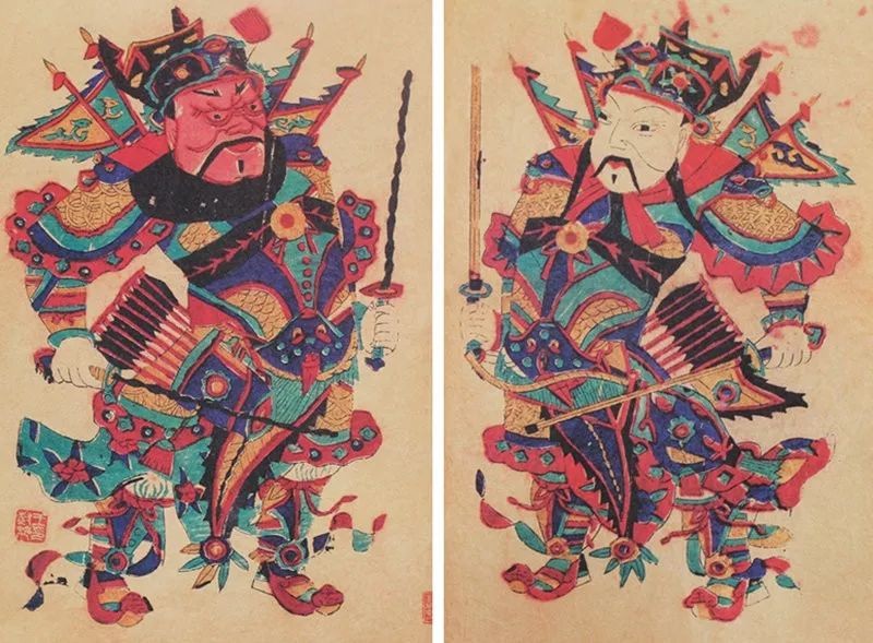 双幅年画的对称性构图更是不胜枚举。门画除了“独座”外都是成双成对的,由于装饰两扇门,构图上要求两幅画中的人物对称,整体外轮廓基本对应,这是自古就沿袭下来的规律。大门的将军门神都是双双相对而立,构图左右呼应对称。但是在形象的重点细节上是有明显的区别,如面相黑红喜怒变化、眼眉胡须表情各异,还有所持不同的器物,形成严格统一而又丰富的画面效果。如在《秦琼—尉迟恭》中,构图就是对称的大结构中包含着细节的变化。秦琼与尉迟恭基本是以相同的姿势和打扮相对而立,两幅图左右对称。秦琼为粉面、细眉凤眼、五绺美髯的俊相,双手握一对金色铜锏;尉迟恭则是赤面、立眉环眼、虬须满腮的怒相,双手执一对黑色钢鞭。