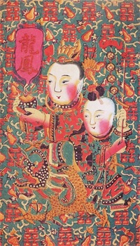 另外,出于年节装饰的需要,年画构图中常常增加一些花边外框、衬底和题字,来烘托画面喜庆吉祥的气氛。1.花边外框型。画面四周有一个由各种吉祥花卉、瓜果、星官、童子、动物、文字和图案构成的花边外框。如门童画《三多吉庆》中,两幅画面均有一大一小两个童子,成对称图式。大童子在前,一手举宝石,一手托海螺;后面的小童子双手握长杆羽扇。上首分别题“三多”“吉庆”四个红色字。画的四周有很宽的花边外框,是由佛手柑、寿桃、石榴和红花、彩蝶串成,增添了浓厚的装饰趣味。 2.背景满铺图案型。画面背景用特定的有寓意的文字、图案满铺,也是北京年画的一种构图方式。如门童画《龙凤呈祥》中,两幅画中各画一对童子,分别骑在金龙和彩凤的身上。他们双手中托起的珍珠和元宝上,生出两片粉云,上写“龙凤”“呈祥”四字。在乘龙骑凤的童子身旁,均有一个手举红蝠系铜钱的童子。背景是墨绿底色上以红色“双喜”字和金黄色“葫芦万代”的图案铺满画面,衬托出新婚喜庆热闹的气氛。