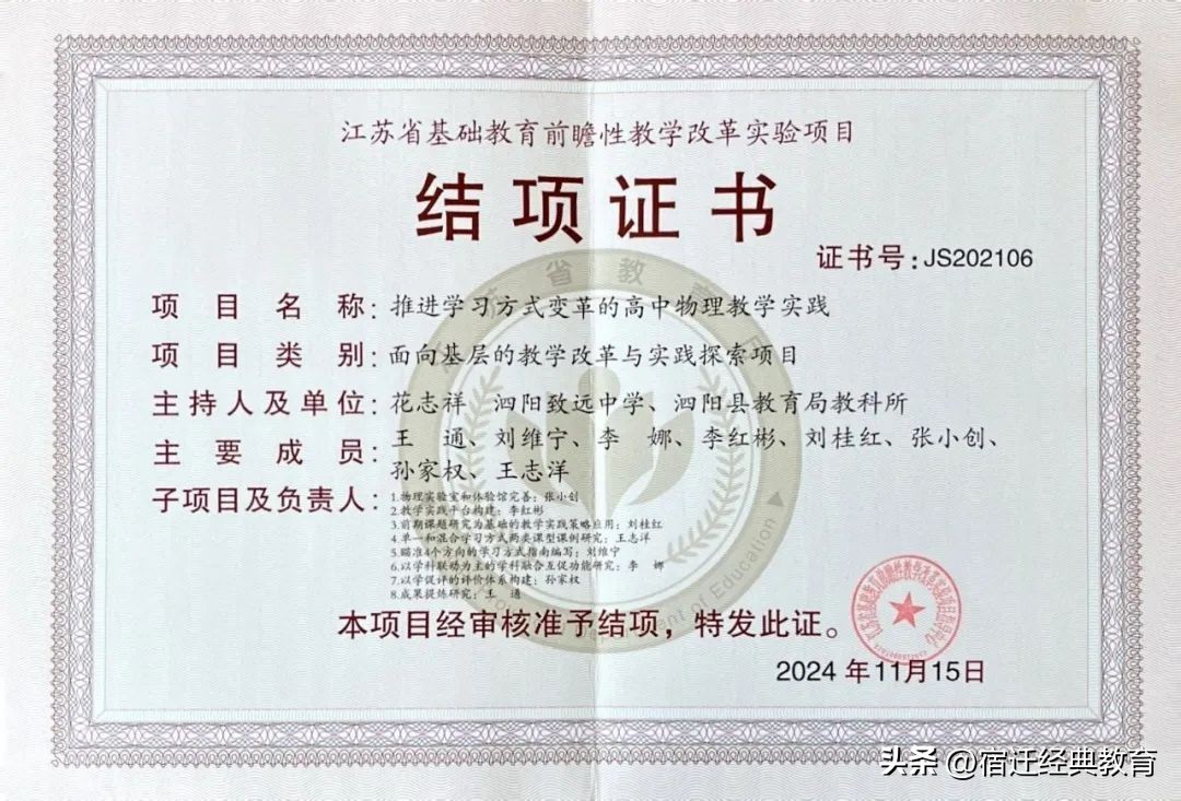 泗阳致远中学江苏省基础教育前瞻性教学改革实验项目“推进学习方式变革的高中物理教学实践”成功结项。