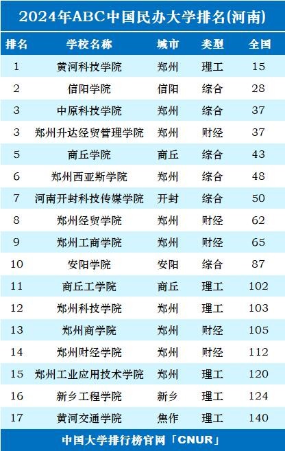 2024年河南民办大学排名一览表:黄河科技学院第一