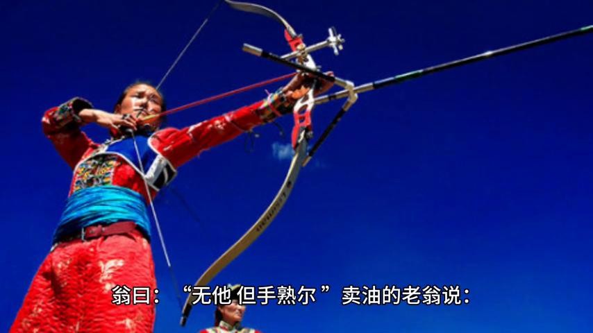 老翁说:"凭我倒油的经验就可以懂得这个道理,乃取一葫芦置于地,以钱覆其口于是拿出一个葫芦放在地上,把一枚铜钱盖在葫芦口上徐以杓酌油沥之。自钱孔入而钱不湿,慢慢地用油杓舀油注入葫芦里,油从钱孔注入而钱却没有湿。因曰:"我亦无他惟手熟尔"。于是说:我也没有别的(奥妙),只不过是手熟练罢了。康肃笑而遣之,陈尧咨笑着将他送走了。