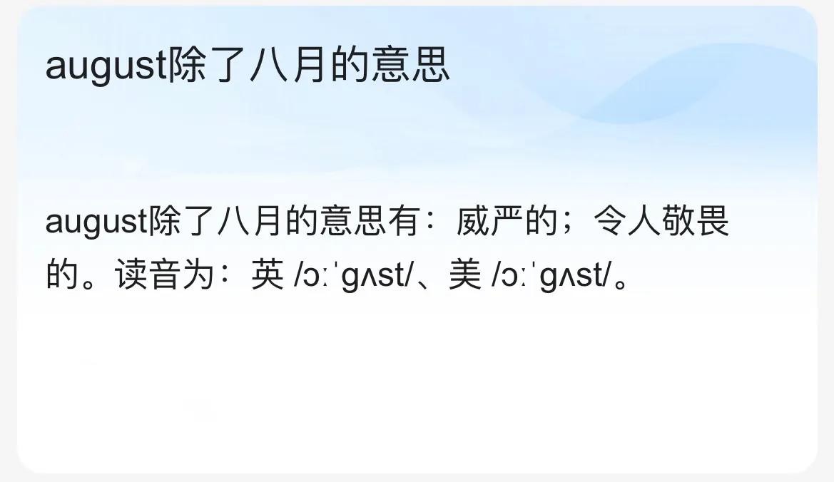 August:[ɔ:ˈgʌst] n.八月 adj.威严的,令人敬畏的。