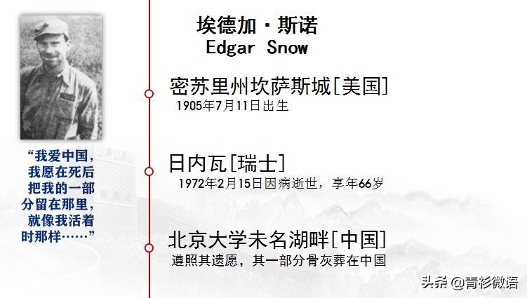 埃德加·斯诺,美国著名记者,1928年来到中国,1936 年 6月至 10月对中国西北革命根据地进行了实地考察,这4个多月的实地考察,他写了14本密密麻麻的笔记本,拍摄了30卷胶卷,成为了第一个向全世界报道红军长征消息的人。当年10月底,斯诺带着他的采访资料、胶卷和照片,从陕北回到北平,根据考察所掌握的第一手材料,经过几个月的埋头写作,完成了《西行漫记》的写作,英文名《红星照耀中国》。