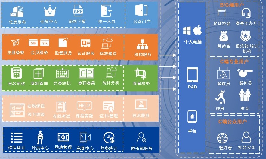 该平台将为基层足球工作的开展提供带来巨大的产业赋能效应,从专业的基层足球协会、裁判员、教练员、比赛监督,到广泛的社会赛事组织者、俱乐部、参赛选手都将在各自应用场景下获得巨大的效能及体验提升。其能够提供的服务将包含日常的协会在籍会员资料认证及管理,社会及基层专业赛事的系统化管理及规范化运营支撑,会员及俱乐部服务体系的构建,足球专业技能培训服务体系建设等。
