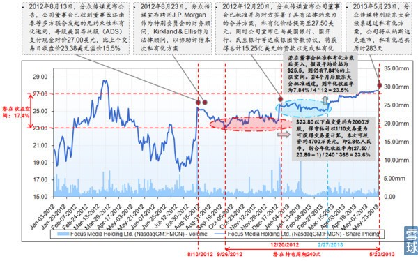 以分众为例,第一阶段年化收益率大概在23%,第二阶段同样可以达到23%。一般来说年化20%-30%是没问题的。当然,重要的是要确定这个私有化交易是不是真的,还是大股东忽悠来抬升股价的。比如XXX、公司