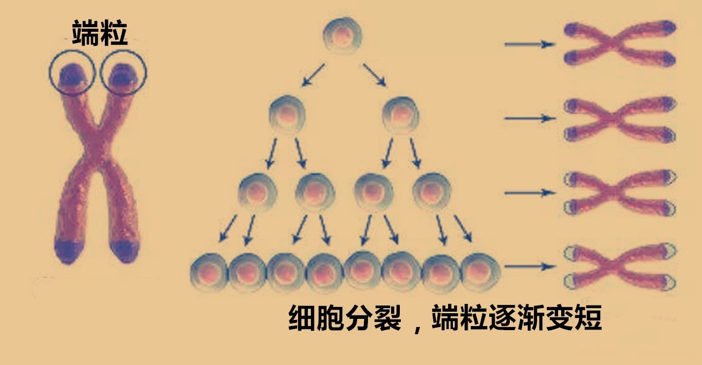 科学家在寻找导致细胞死亡的基因时,发现了在细胞顶端的一小块物质,像一顶帽子置于染色体头上,称之为端粒,细胞每分裂一次,端粒就缩短一次,当端粒无法继续分裂时,细胞也就到了普遍认为的分裂100次的极限并开始死亡(人的年龄约为100岁左右),因此,端粒被称为“生命时钟”