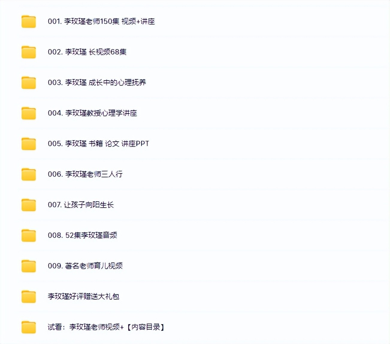 李玫瑾育儿心理学视频+音频全集(分别52集):内容上,不仅有李玫瑾老师亲子育儿方面知识,还有一系列心理学讲座。
