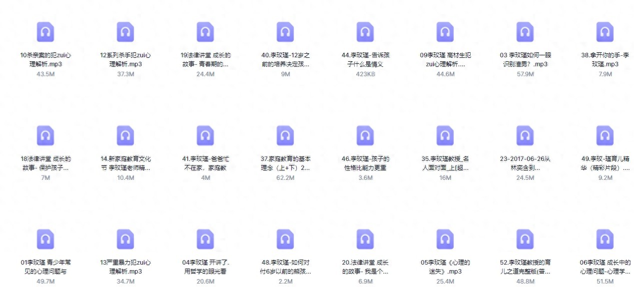 包括:52.李玫瑾教授的育儿之道、51.成长中的心里抚养、50.李玫瑾:怎样的童年造就今天的个性、49.李玫瑾育儿精华、48.李玫瑾:如何对付6岁以前的熊孩子、47.李玫瑾:孩子如果被欺负了是否要还手?、46.李玫瑾:孩子的性格比能力更重要、45.李玫瑾:孩子不听劝该怎么办?、44.李玫瑾:告诉孩子什么是情义、43.李玫瑾:防止孩子自私应该这样培养、42.李玫瑾:不要回避和孩子谈行性、41.李玫瑾:爸爸忙不在家,家庭教育怎么弥补?、40.李玫瑾:12岁之前的培养决定孩子的一生、39.李玫瑾:孩子做作业很拖拉怎么办?、38.拿开你的手-李玫瑾、37.家庭教育的基本理念(上+下)、36.李玫瑾教授_名人面对面_下、35.李玫瑾教授_名人面对面_上、34.李玫瑾谈犯罪心理学研究、33.把马加爵“剥”得太干净会伤其家人、32.李玫瑾谈反社会人格与“天生犯罪人”、31.重庆男童被摔案伤害了人类基本情感、30.ZUI心理画像是利用心理学描述形象、29.身体莫名疼痛或是脑神经“作祟”、28.暴力伤医凸显三方面问题、27.李玫瑾谈甘肃白-银-连环杀人案、26.杀妻男人在外表现定是怂人、25.恋爱很容易 婚姻却需要选择、24.分析丰县爆炸案 呼吁社会关注心理问题、23.从林奕含到阿廖沙李玫瑾谈性侵案、22.武大女大学生精神病、21.李玫瑾谈章莹颖案、20.法律讲堂成长的故事-我是个坏小孩+成长中的性与爱、19.法律讲堂成长的故事-青春期的红色信号、18.法律讲堂成长的故事-保护孩子的理由、17.成长的故事-心怀暴力的孩子、16.成长的故事-伸向钱包的小孩、15.关注贫困地区的女性生存状态、14.新家庭教育文化节:李玫瑾老师精彩讲座、13.严重暴力犯罪心理解析、12.系列杀手犯罪心理解析、11.未成年人违法犯罪心理解析、10.杀亲案的犯罪心理解析、09.高材生犯罪心理解析、08.家庭教育的心理抚养、07.青少年心理讲座、06.成长中的心理问题:心理学专家教你如何正确的教育孩子、05.李玫瑾《心理的迷失》、04.李玫瑾-开讲了:用哲学的眼光看世界、03.李玫瑾:如何一眼识别渣男?、02.李玫瑾:失恋是一种病、01.李玫瑾育儿心理讲授:青少年常见的心理问题与对策