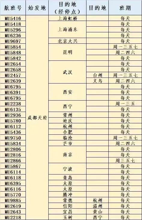 根据东航四川分公司公布的天府机场首批航线转场计划,7月1日起,东航在成都天府国际机场运营的航线包括成都至北京大兴、上海浦东、上海虹桥,以及昆明、武汉、杭州、太原、西安、青岛、合肥、西宁等20余条直飞或经停航线,不少航线天天都有航班在天府国际机场执飞。