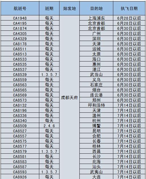 近日,国航通过其微信公众号公布天府机场航班计划。6月28日以后,国航在成都天府机场运营的航线包括成都至北京首都、上海浦东、广州、深圳、海口、西昌、昆明、天津等30余条航线。
