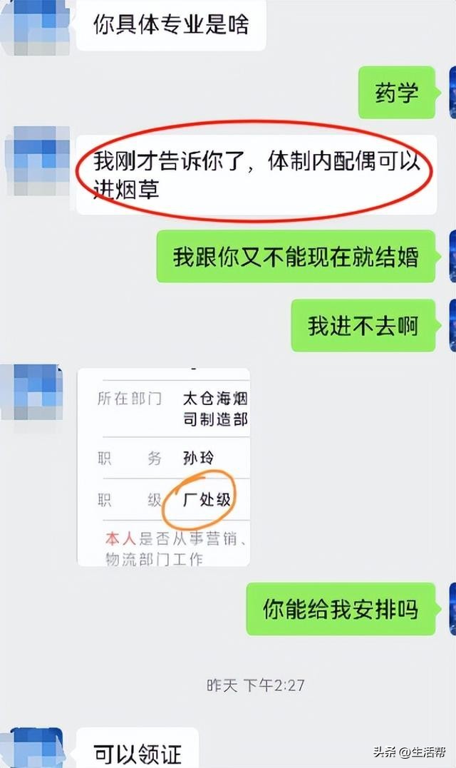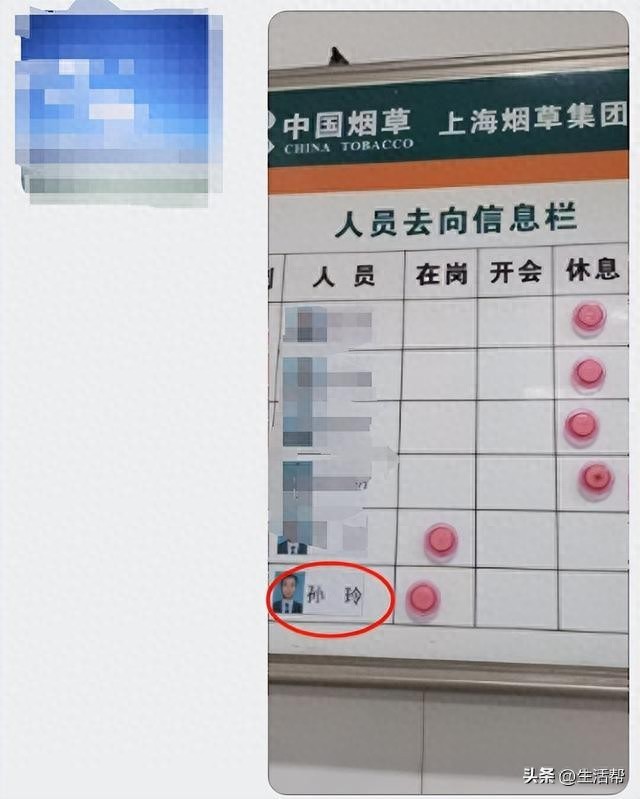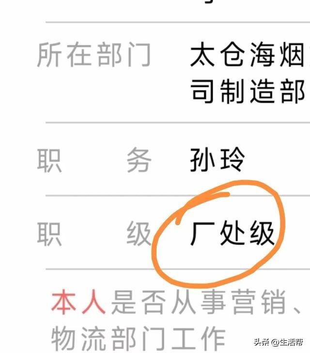 为了增进对彼此的了解,两人互发了照片,孙玲还发了自己的工卡、办公软件截图、“人员去向信息栏”图片,以证明自己“烟草公司高管”的身份。工卡信息显示“工号:640198,姓名:孙玲”,办公软件显示“所在部门:制造部,职级:厂处级”。
