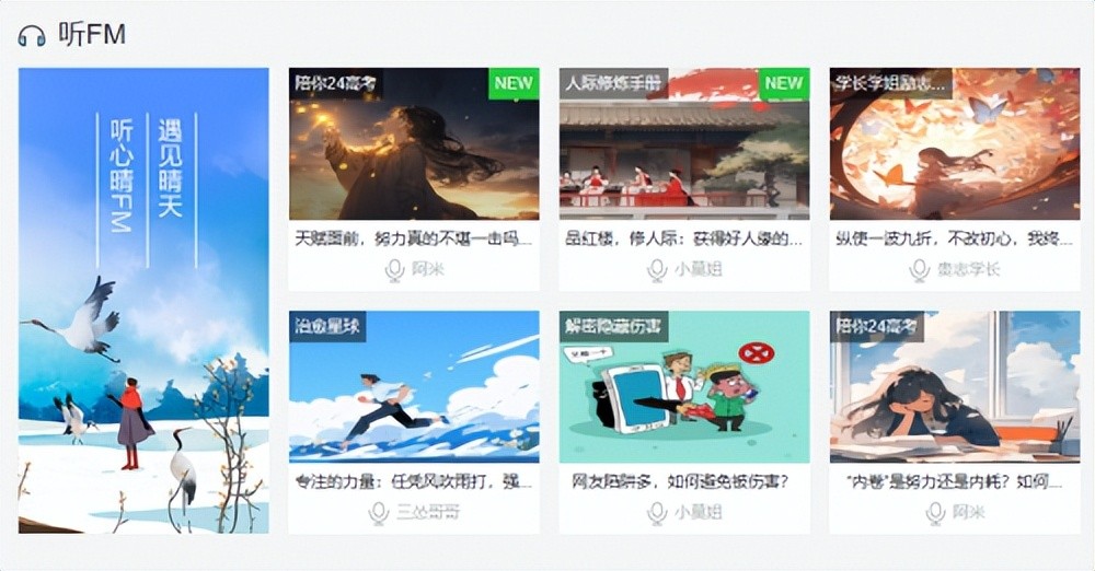在线上,杭州铭师堂也在升学e网通中推出”心灵成长“板块,开设有心晴FM和心事Weekly栏目,用主播的轻柔话语讲述出一个个或励志或温馨的故事,缓解高中学子学习生活的压力。