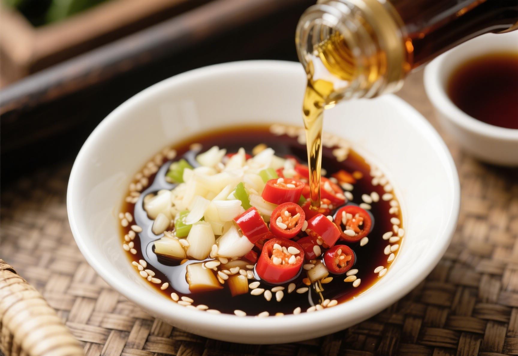 蒜末+小米椒碎+白芝麻,浇上滚烫菜籽油激发香气。趁热调入: