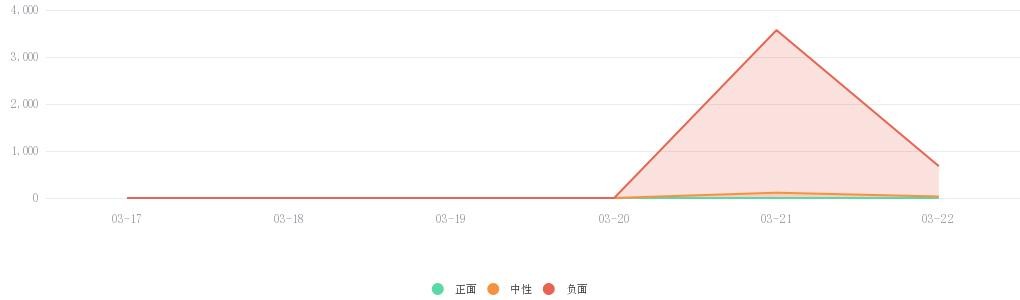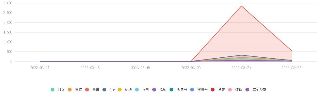 分析时段内,微博舆情信息热度波动最大,在03月20日达到波谷0条,在03月21日达到波峰2853条,在03月22日达到次波峰543条。网页、微信、APP、论坛、报刊、视频、头条号、搜狐号、问答、评论、其他类型的舆情信息热度小于微博平台。