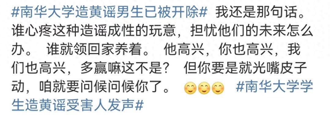 南华大学在事件爆出后四个小时就在微博发布声明回应称,我校学生何某某违法行为属实,公安机关已作出行政处罚决定并且学校给予该生开除学籍处分,后续南华大学学生造黄谣受害人发声:我想知道他为什么这么做,多么无力的发文!先前南华大学造谣学生已被保研至中科大,3月22日早,中科大发文回应称:已取消该学生推免生录取资格!