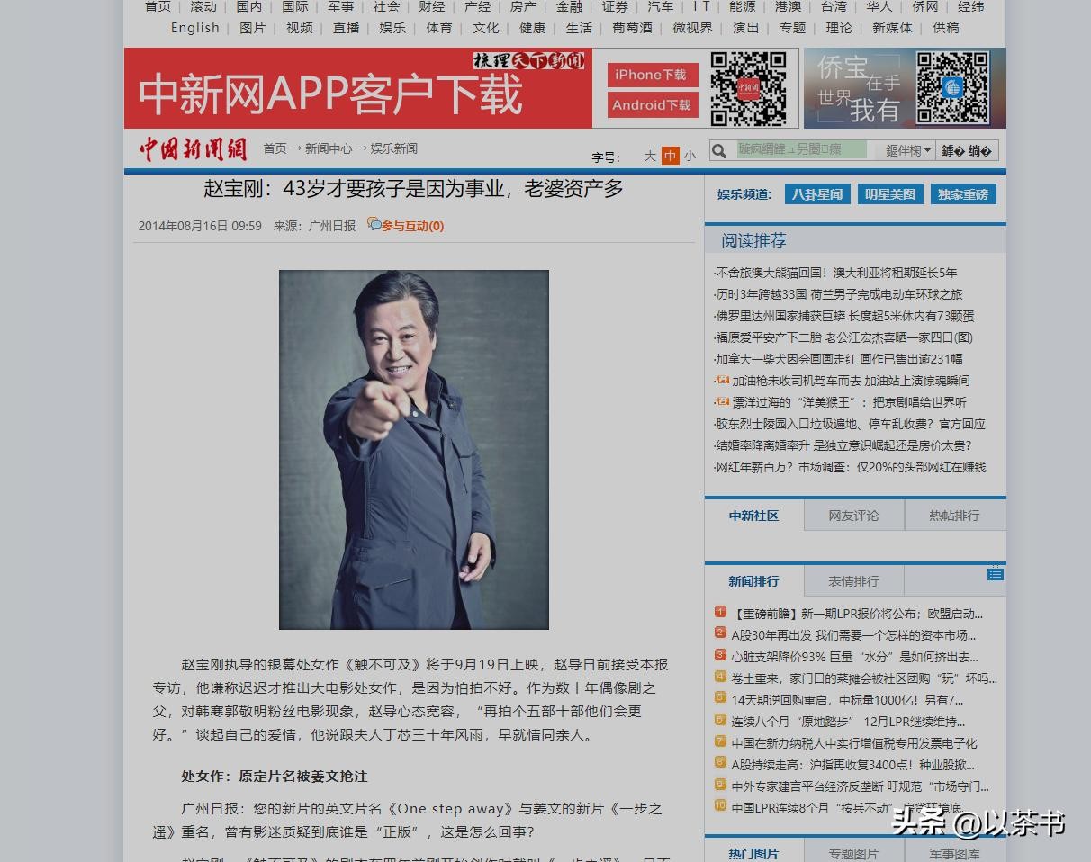 中国新闻网 2014年08月16日《赵宝刚:43岁才要孩子是因为事业,老婆资产多》