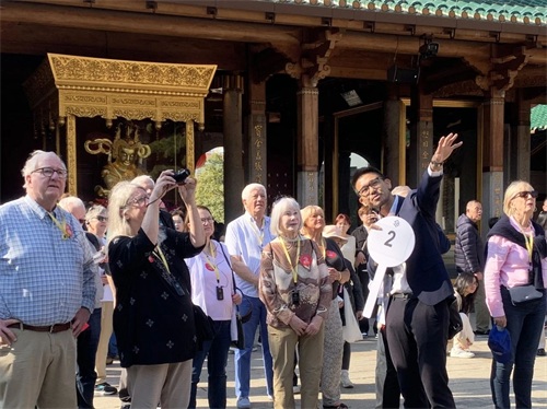 外国游客在厦门南普陀聆听外语导游的讲解。