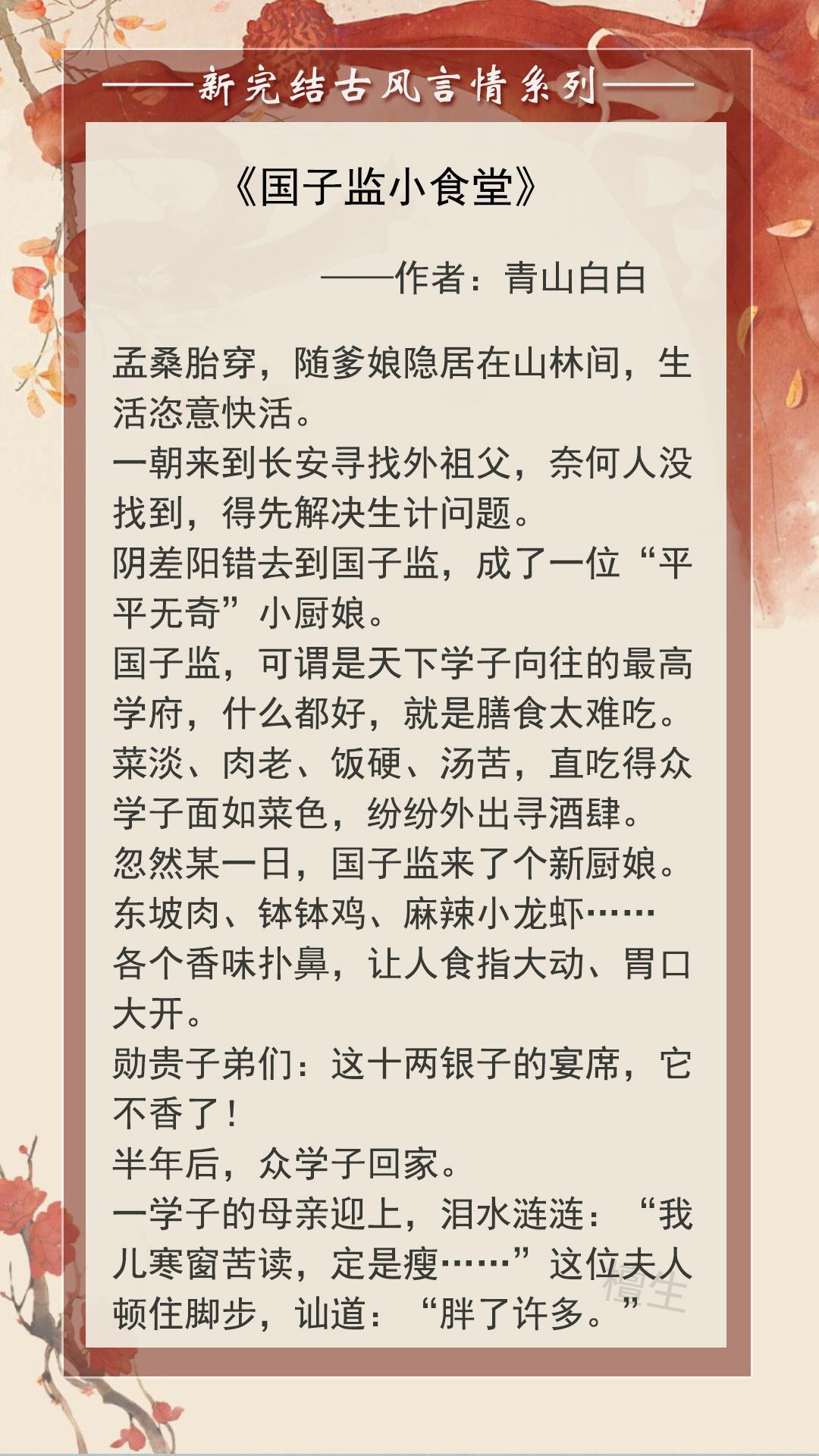 这篇文以国子监日常为主,讲述一个穿越来的打工人用美食征服古人味蕾的故事。作者文风颇有古韵,群像精彩,美食诱人,处处透着人间烟火味,又在细节处营造出文人雅客的诗情画意,既接地气又聚人气。