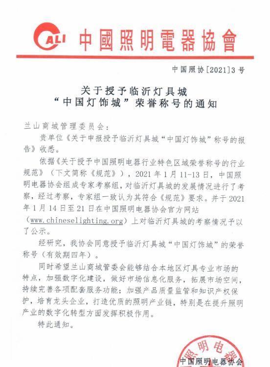 2025年1月11-13日,中国照明电器协会组成专家考察组,依据《关于授予中国照明电器行业特色区域荣誉称号的行业规范》,对临沂灯具城的发展情况进行了考察,经过考察,专家组一致认为其符合《规范》要求。