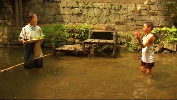 昭广第一次来到外婆家,看见坐落在河水和草丛之间的破茅屋,屋顶一半的茅草剥落,露出随意钉的铁皮,没错这就是外婆住的房子,让他十分不安和失望。