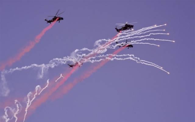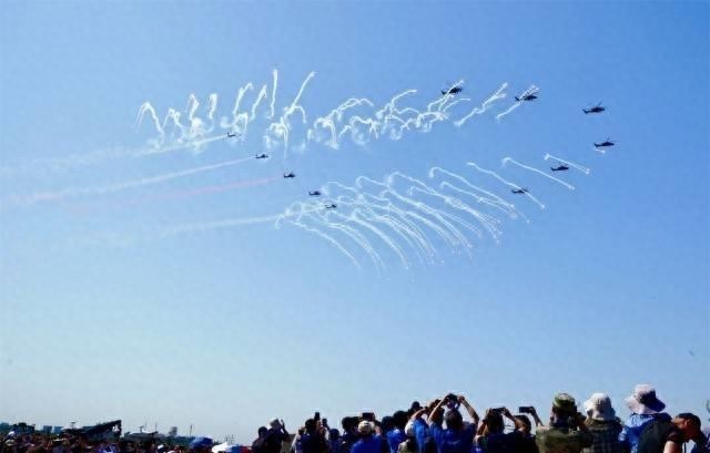 开幕式上,航空工业研制的18架六型军用和民用直升机在天空中和平飞行、翩翩起舞,为观众带来了一场直升机空中派对。