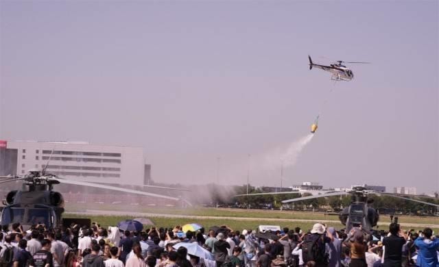 飞机工业研制生产的AC352、AC312E紧随编队飞行,按顺序进行。 AC311A进行斗式着陆演示,凸显了AC系列民用直升机的性能,展示了国家应急救援装备的专业能力。