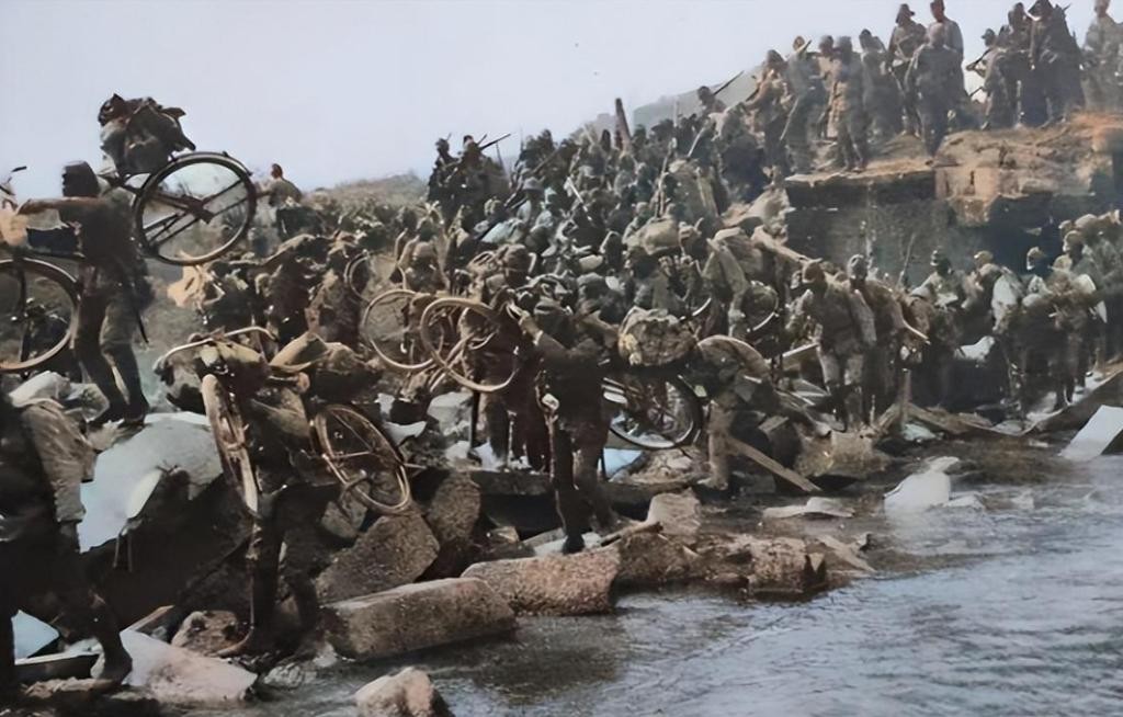 16.日军掠夺物资,肩负沉重过河,尽显禽兽本性。