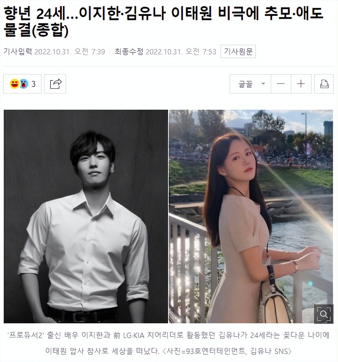 她遇难的消息是同事和好友传出的,他们在社交平台发文悼念金宥娜,称知道噩耗后哭了很久,无法接受这个事实,希望喜欢她的人能来葬礼送她一程。