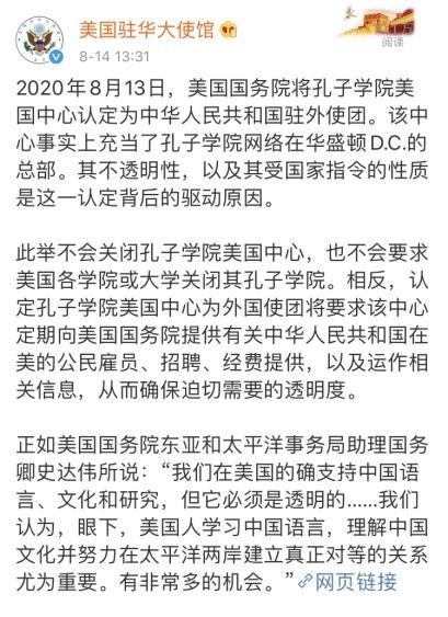 就在此前一天,在匿名知情人士提前对媒体放风之后,美国国务卿蓬佩奥宣布,要求孔子学院美国中心登记为“外国使团”。路透社称,这是华盛顿与北京之间关系恶化的最新迹象。据路透社报道,蓬佩奥在一份声明中声称,设在华盛顿的孔子学院美国中心是“一个推动北京在美国校园以及中小学课堂进行全球宣传以及恶意影响活动的实体”。针对此事,孔子学院美国中心(CIUS)当地时间13日回应称,不同意美国国务院的这一指定,
