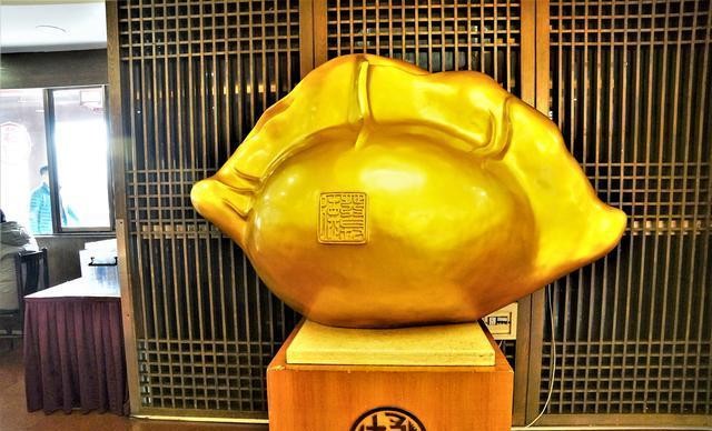 德发长一楼进去,有一个巨大的饺子,金光闪闪的,玻璃柜子里,还有五颜六色,形状各异的饺子。一楼是大众餐厅,素饺子,肉饺子,有蒸饺,快餐粥,早餐,深夜食堂。饺子有特色酸汤水饺,菌菇酸汤水饺等等。图中是一楼的大饺子。