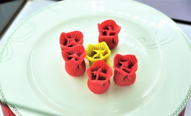 宴会厅里既有客人在吃饭,还有一些小朋友在包饺子,德发长可能经常举办这种活动,因为德发长的饺子制作技艺是非物质文化遗产。它以318种馅和318种形状饺子,赢得了大世界吉尼斯世界纪录。图中是德发长饺子,惟妙惟肖,像牡丹花。