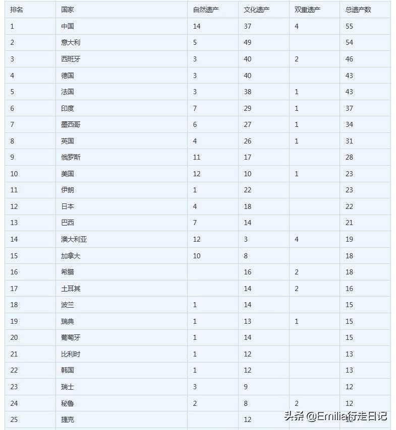 世界遗产最多的国家排名