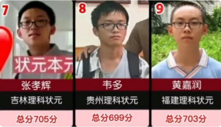 贵州的理科状元是一名姓韦的考生,高考成绩是699分,福建的理科状元是一名姓黄的考生,高考成绩是703分。