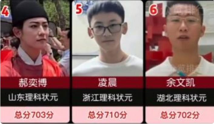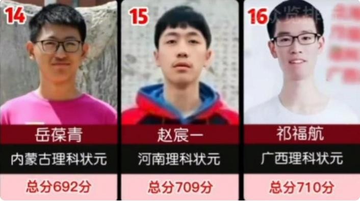 山东的理科状元是一名姓郝的考生,高考成绩是703分,浙江的理科状元是一名姓凌的考生,高考成绩是710分,湖北的理科状元是一名姓余的考生,高考成绩是702分。