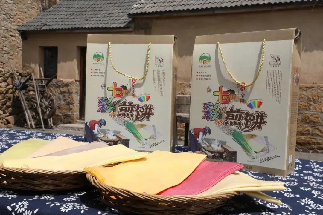 七彩煎饼,是勤劳聪慧的沂南群众,在传统沂蒙煎饼的基础上发展而来的,有着复杂的工艺制作流程。当地村民将天然种植的玉米、小米、小麦、高粱等谷物,用石磨磨成糊,经发酵后加入菠菜、火龙果等果蔬汁,用传统的炉灶、铁鏊子细细烙制而成的薄如蝉翼、香脆可口、营养丰富的七彩煎饼。