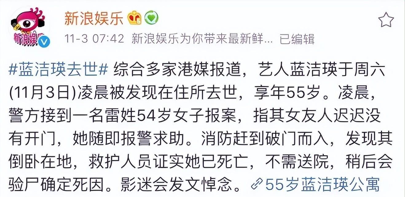 2018年10月31日,蓝洁瑛死在了自己的家中,直到11月3日凌晨尸体才被发现,她的离世也引起了广泛的关注,甚至还牵扯到一起已经无法查证的陈年往事,而这件事情则牵扯到了两个在娱乐圈地位很高的明星。