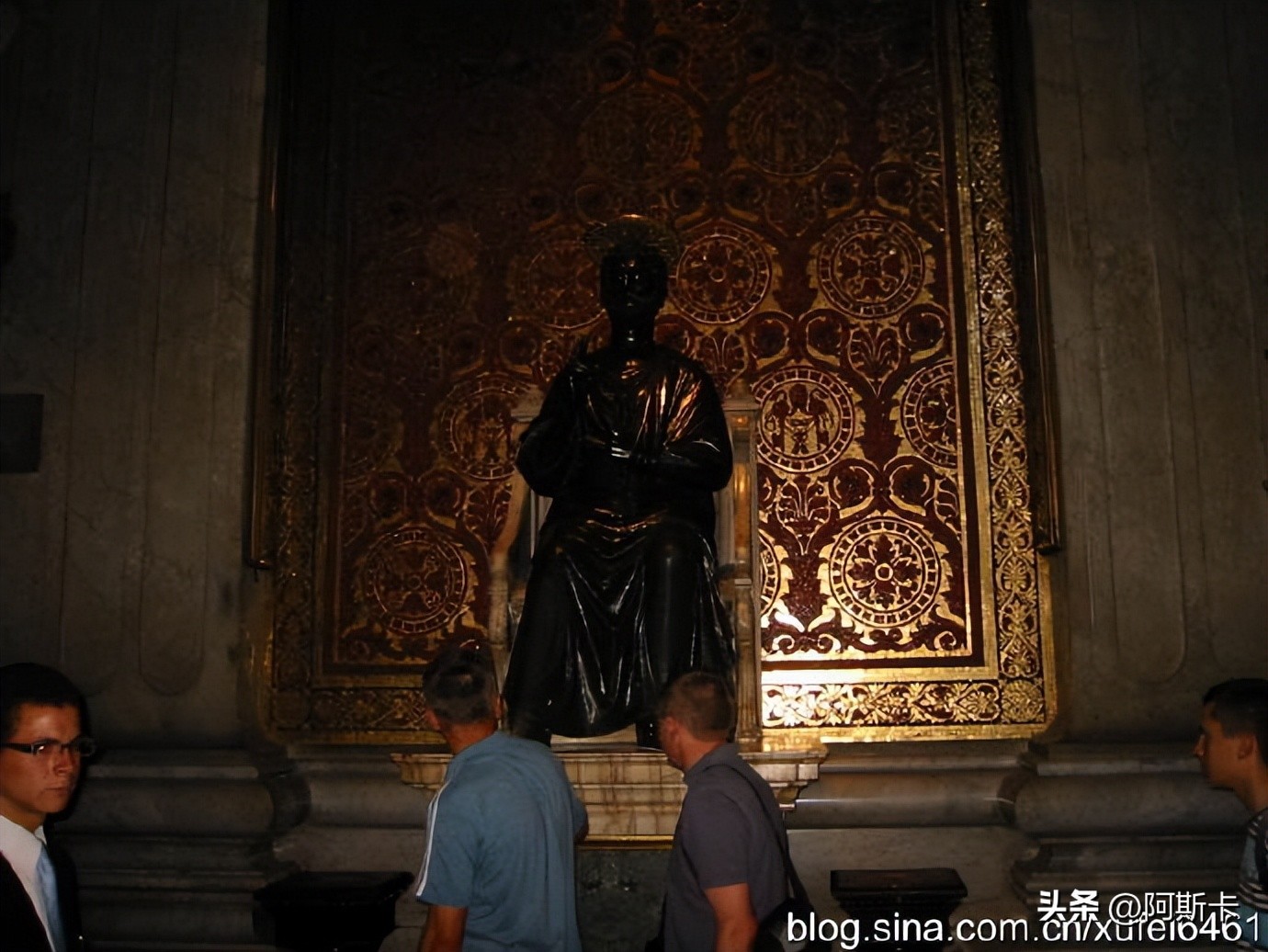 三是圣彼得宝座,也是贝尔尼尼设计的一件镀金的青铜宝座。宝座上方是于光芒四射的荣耀龛及象牙饰物的木椅,椅背上有两个小天使,手持开启天国的钥匙和教皇三重冠。传说这把木椅是圣彼得的真正御座,后经考证为加洛林国王泰查二世所赠送。