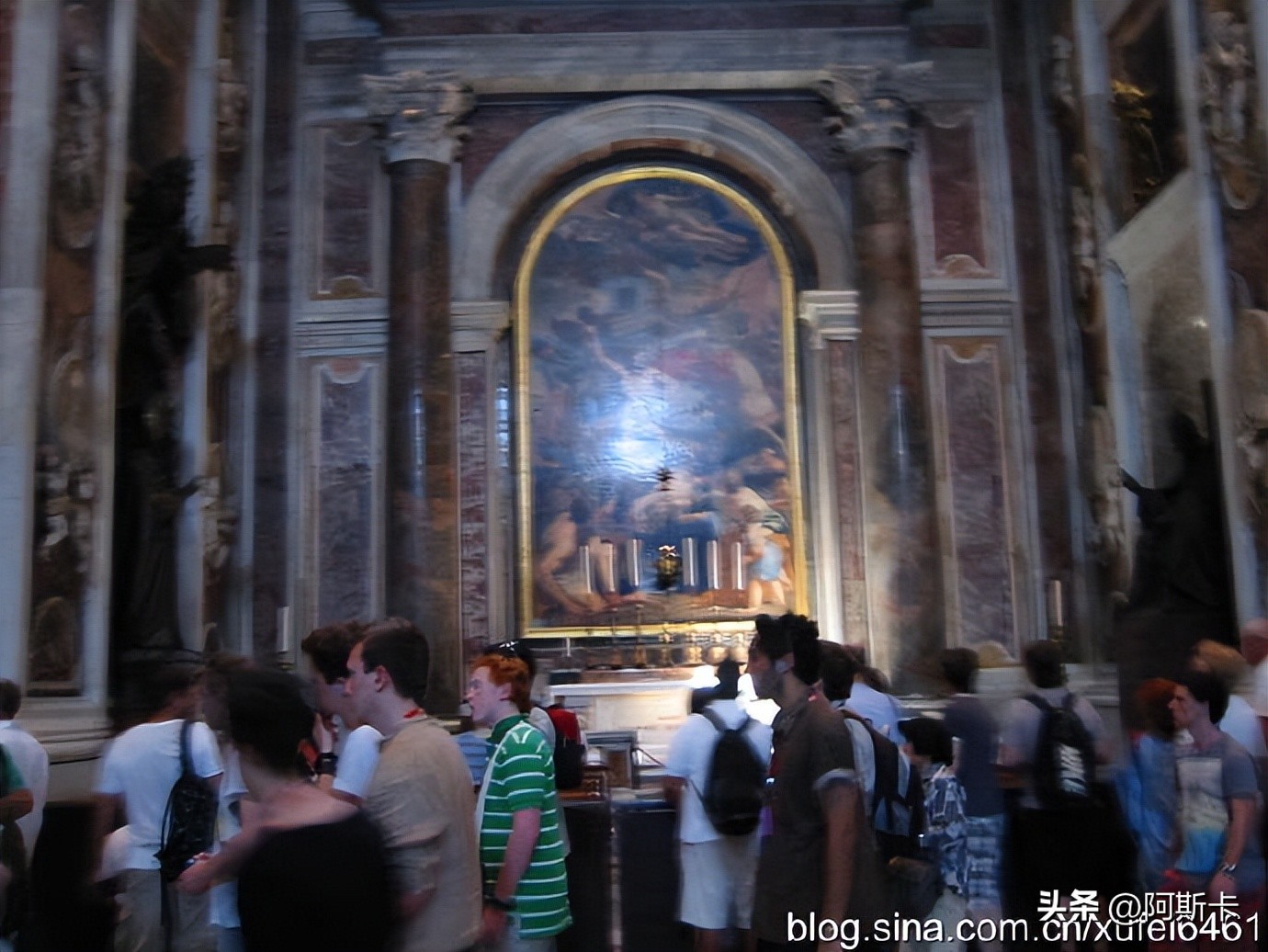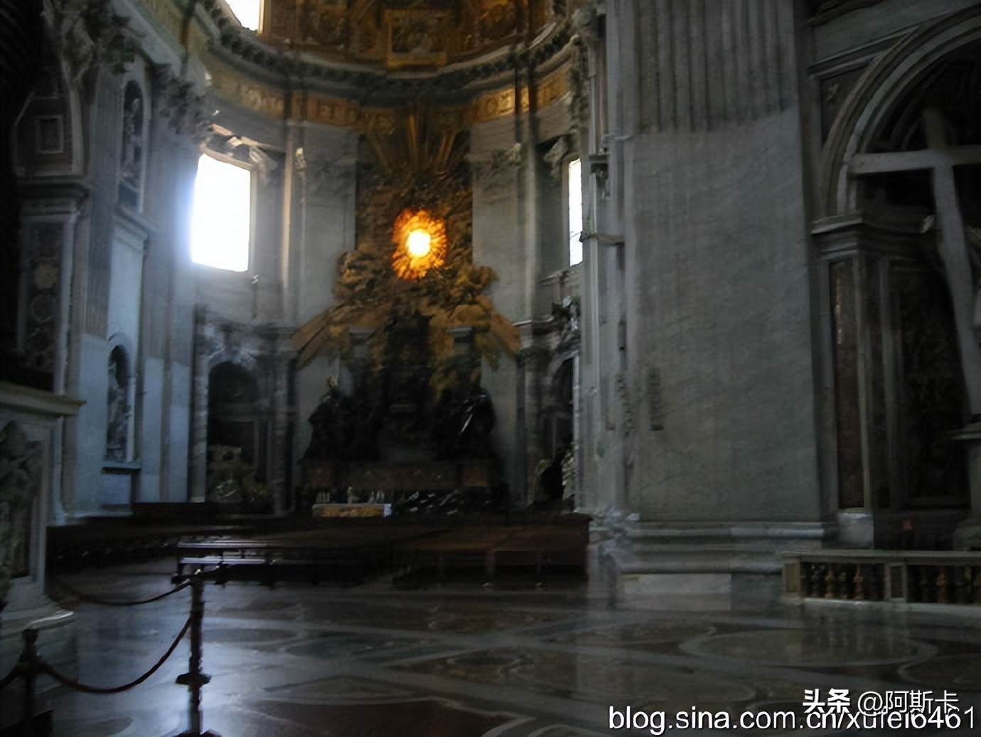 二是贝尔尼尼的雕制的青铜华盖。它由4根螺旋形铜柱支持撑,足有5层楼房高那么高。华盖前面的半圆形栏杆上永远点燃着99盏长明灯,而下方则是宗座祭坛和圣彼得的坟墓,只有教皇才可以在这座祭坛上,面对东升的旭日,当着朝圣者举行弥撒。