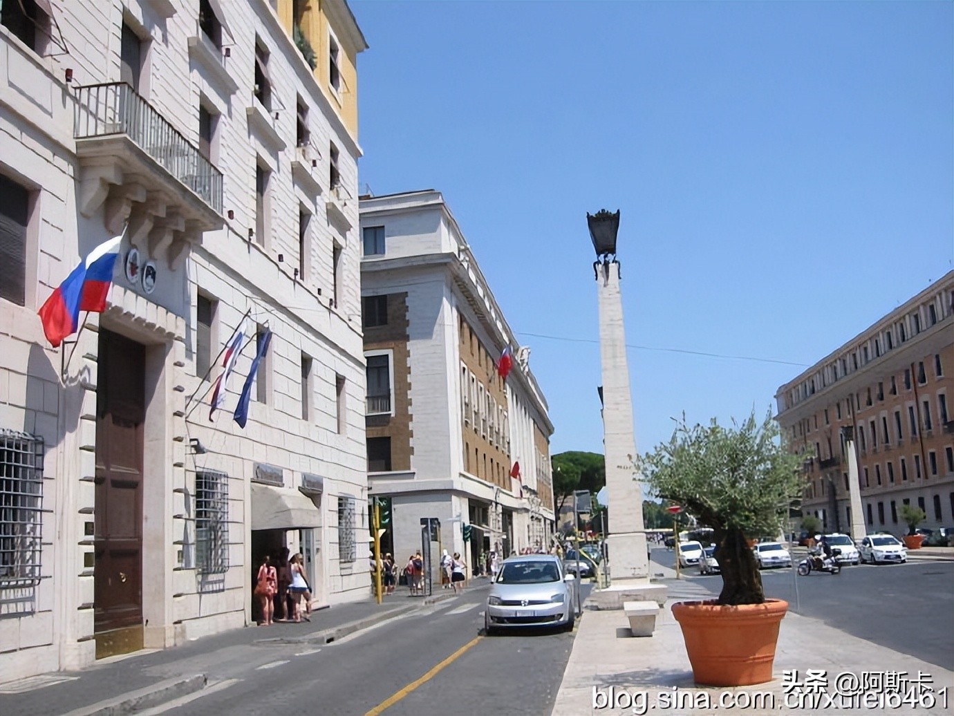 梵蒂冈同161个国家和地区有正式外交关系,在联合国设常驻观察员。中国与梵蒂冈无外交关系。图为“两边的大楼为各国的使馆办公大楼。有很多国家把国旗挂在大楼外面。前方高处可看见“中华民国”旗。