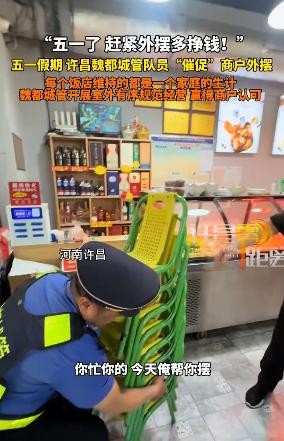 刚刚过去的五一假期,有这样一条暖新闻登上热搜:五一期间,许昌魏都城管队员“催促”商户外摆,开展室外有序规范经营。这一举措,不仅赢得商户认可,也受到多位网友的点赞支持。