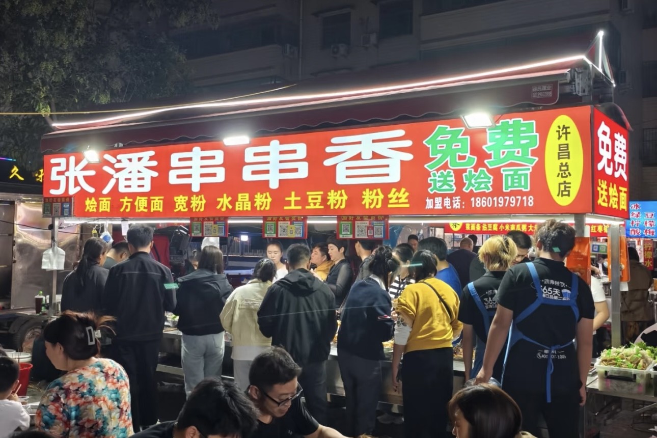 张潘夜市,当地人的小众宝藏。炸鱼外酥里嫩,还能吃到许昌独一份的“串串香”。建议19:00后到访,看着摊主们推着餐车从四面八方汇成星河,本身就是一场烟火大秀。