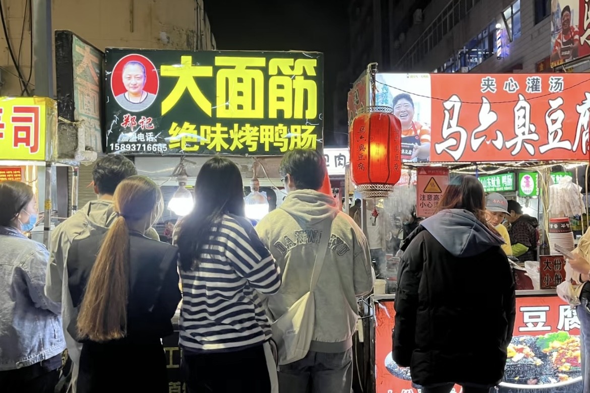 春秋广场夜市,老饕心中的“白月光”。10元管饱三件套:梁三卷馍用四层烙馍裹住卤蛋+面筋+豆芽,臭豆腐浇上秘制剁椒,最后用杏仁茶解腻收尾。这里有着内行人才知道的彩蛋,南侧巷口的“二十年关东煮”,萝卜吸饱了鸡汤,是本地人私藏的深夜食堂。